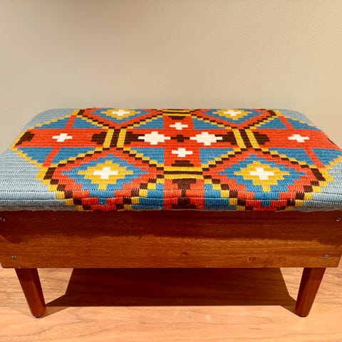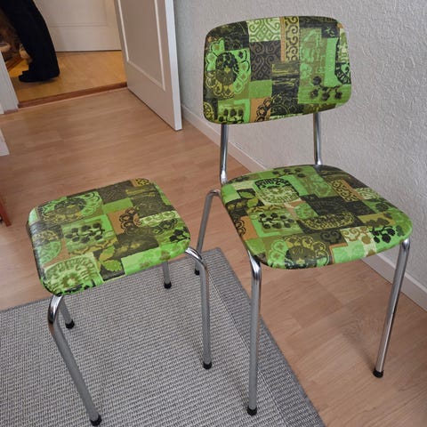 Gammel krakk i teak. Trekk er helt men slitt. Noe slitasje på ben, men fortsatt pen.