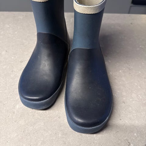 Tretorn gummistøvler i størrelse 32, designet for unisex bruk. Støvlene er blå med oransje såle.