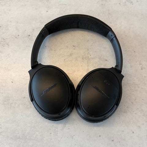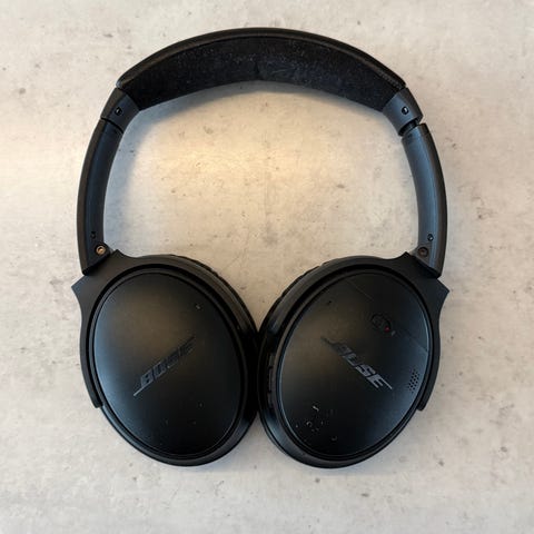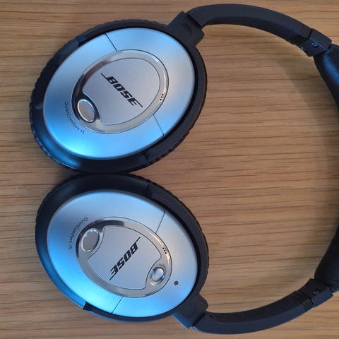 Bose QuietComfort 15 hodetelefoner i sølvfarge. Disse hodetelefonene er kjent for sin støydempende teknologi som gir en forbedret lytteopplevelse. De kommer med en bæreveske, kabler for enkel tilkobling til ulike enheter. Ideelle for reiser og daglig bruk.