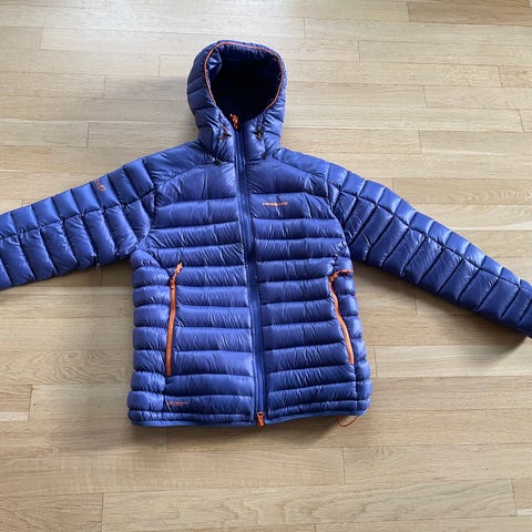 Dunjakke fra Vikafjell i str M. Knallblå farge med Orange fór. Lett og varm på en gang.