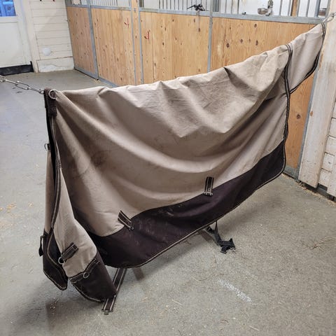 Veldig pent ride/regndekken str full. Sort med brun kant.