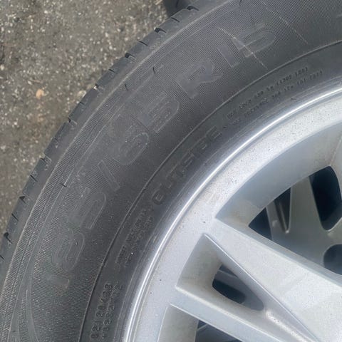 Fordekk (2016) trenger nok å byttes, mens bakdekk (2018) fremdeles har greit med mønster.