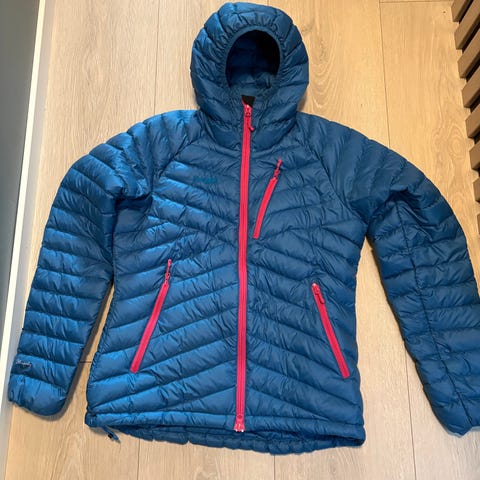 Bergans dunjakke i blå farge, størrelse S. Jakken er laget av nylon med dunfyll, designet for kvinner. Den har glidelåslommer og er egnet som yttertøy for utendørs bruk.