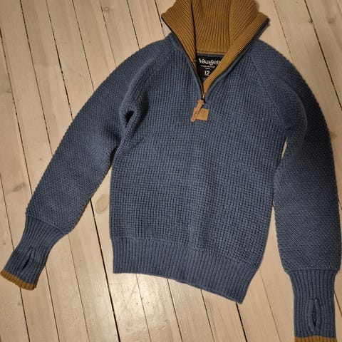 Vikafjell barnegenser i ull, størrelse 152, grønn farge. Genseren har bomullsfor i halsen og på håndleddene. Ellers 100% ull. . Passer for både gutter og jenter.