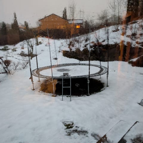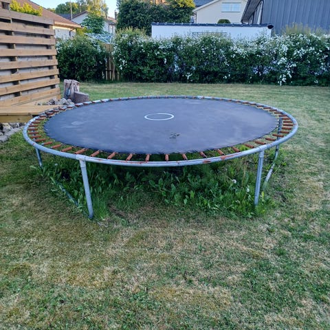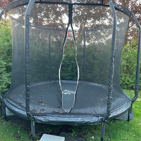 En knekt stang rundt toppen av nettet, røket litt i dekket rundt kanten, men ellers hel og pen.