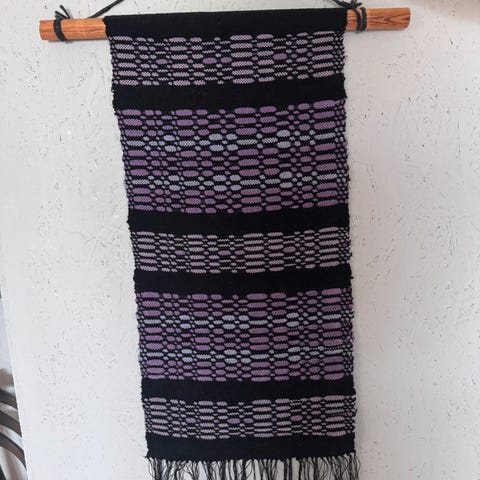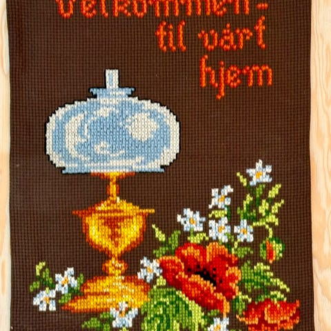 Baksiden er kledd med grov bomullsduk, og teppet har tradisjonelt smijernsoppheng for enkel montering. Trolig produsert på 1960-tallet.