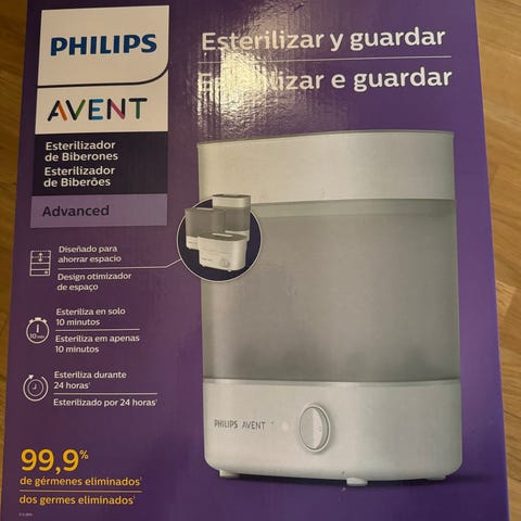 Philips Avent Microwave Sterilizer er en bærbar steriliseringsenhet laget av hvit plast. Den er designet for å sterilisere opptil 4 flasker og tilbehør på kort tid i mikrobølgeovn. Enheten er lett og enkel å bruke, og passer til de fleste Philips Avent-flasker. Den eliminerer 99,9 % av bakteriene ved bruk, og er egnet for daglig bruk hjemme eller på reise.