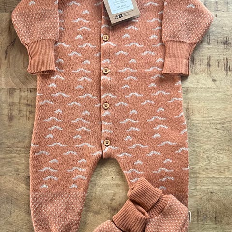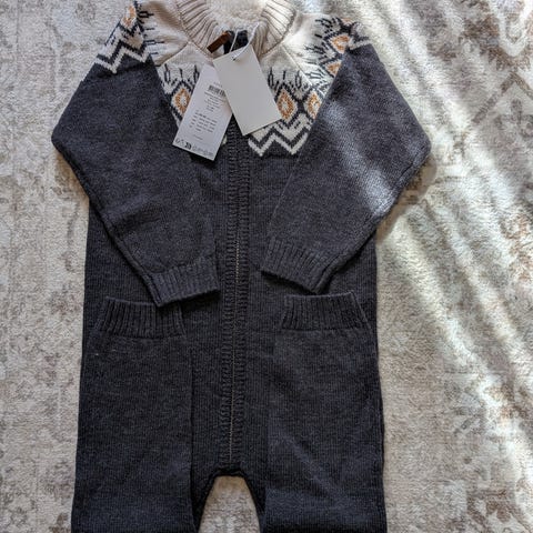 Helt ny og ubrukt ulldress / one piece, mørk blågrå farge i 100% merinoull fra Voksi selges da vi uventet fikk arvet ull av venner. Perfekt for baby nå som det blir kjøligere.