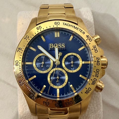 Hugo Boss Herreklokke med kronograffunksjon, grønn urskive og stålarmbånd. Klokken har flere små urskiver for tidtaking og datoindikasjon. Designet for herrebruk med en robust og elegant stålramme.