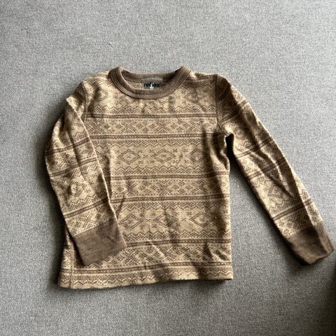 Name it genser i størrelse 122-128 (7-8 år) for barn, unisex. Genseren har brun farge med mønster i hvitt og brunt. Aldri vært brukt men er uten lapp.