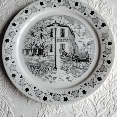 Porsgrunn Samler Tallerken med dekorativt motiv som markerer perioden 1905-2005. Tallerkenen har bilder og symboler relatert til norsk historie og kultur, i farger med detaljer i rødt, svart og hvitt. Egnet som veggdekor eller samlerobjekt.