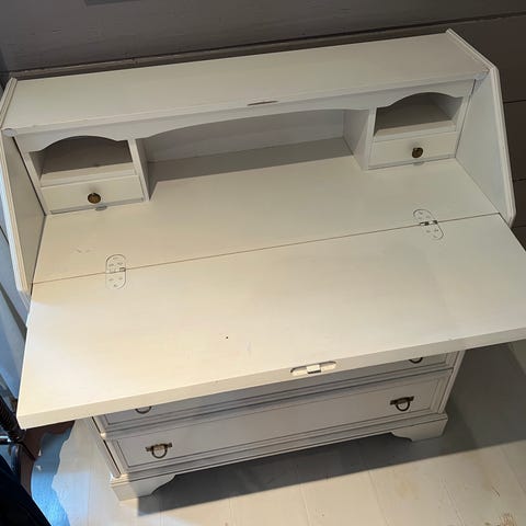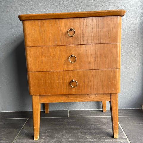 Ca 35 cm. Den er litt bredere i bakkant (ca 55 cm) enn i forkant (ca 48 cm). Tre skuffer. Et lite matt område oppå, se foto.
