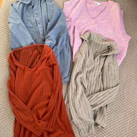 To jeansskjorter/dongeriskjorter fra H&M og to burgunderrøde bluser fra H&M i str. 38.