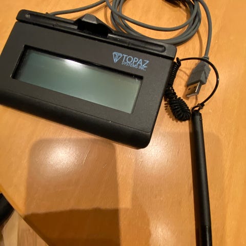 Parti med tre Topaz SignatureGem signaturplater med tilhørende penner og USB-kabler. Én enhet har sprekk i skjerm, mens de to andre ser fysisk intakte ut. Alle er utestet og selges som de er – perfekt for reparasjon, testing eller reservedeler.