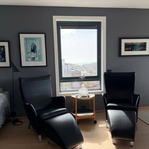 Vurderer å selge to stk lenestoler i sort skinn med dekor søm. Stolene er designet av Carl Henrik Spak for Ire møbler. I god stand, solide og kan låses i tilbakelent posisjon. Ny pris per stol er 21000. Selges eventuelt samlet til høystbydene over 5500