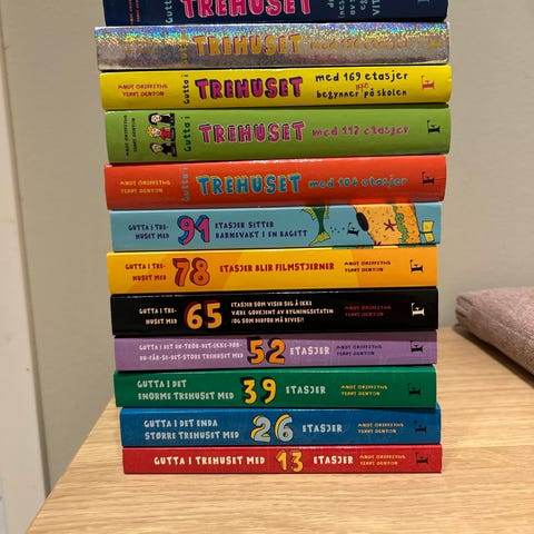 Selges samlet. Trehuset serie tegneseriebøker på norsk. Inkluderer flere bind med illustrasjoner og tekst. Passer for lesere som er interessert i humoristiske og eventyrlige historier.