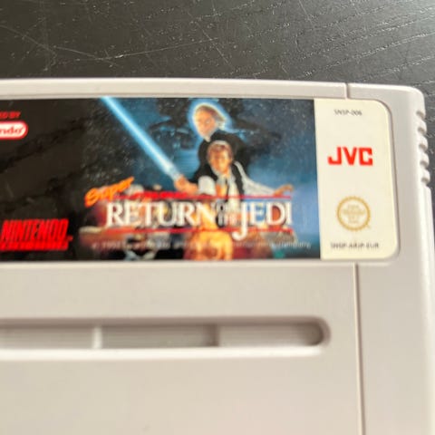 Nintendo Star Wars Return of the Jedi Super Nintendo spill med original kassett, instruksjonshefte og original emballasje. Spillet er designet for Super Nintendo-konsollen og inneholder klassisk Star Wars-tema.