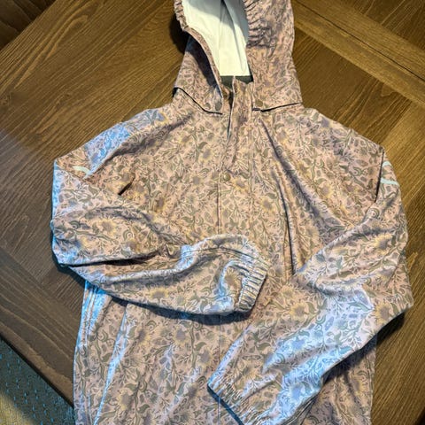 Strikken kan strammes i livet, reflekser og glidelås+ knapper, fotstrikkene er intakte.