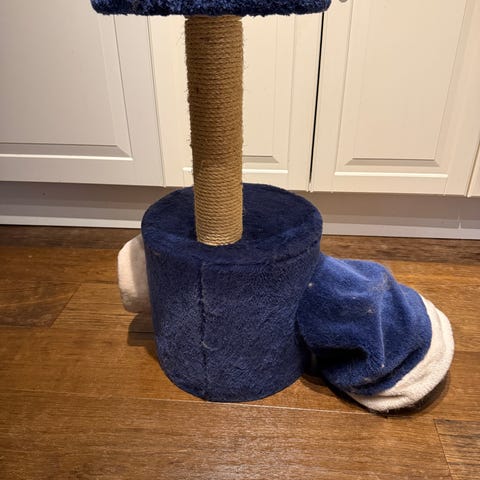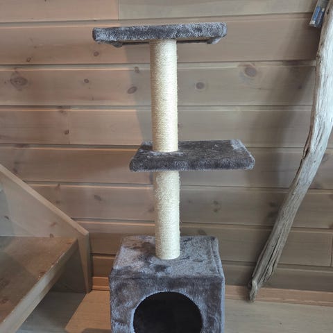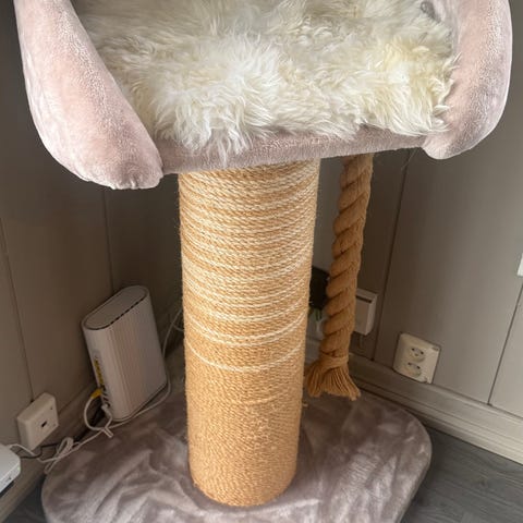 Stort klorestativ,soveplass for store katter. Stødig og solid.Kremfarget Natural Paradise XXL. Nyvaskede pene men brukte puter. Noen tønner er tydelig brukt men skjøtet på nytt tau. Ett pledd og en hengekøye mangler. Kan kjøpes på zooplus.no. Monteringsanvisning også på nett. Er demontert og ligger klar med skruer og verktøy.