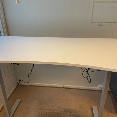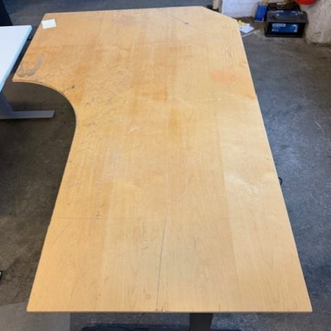 Høydejusterbart arbeidsbord 220x115 cm med plate i eik finer og sort understell. Regulerbar høyde 68-80 cm. Bordet har en ergonomisk form med utsparing for bedre arbeidskomfort. Passer til kontorbruk og arbeidsstasjoner som krever justerbar høyde og solid konstruksjon. Har 2 stk av dette.