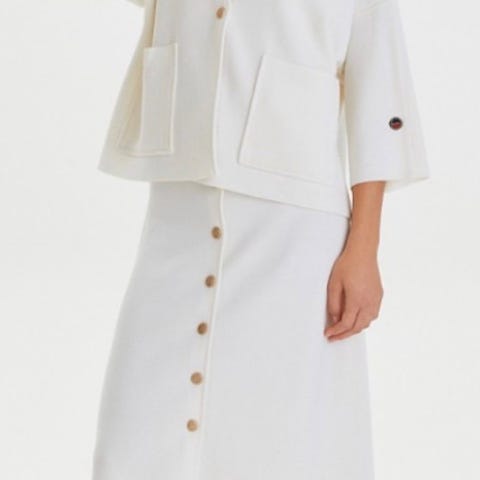Busnel Bella Coat er klippet i en rett form, detaljert med strukturstrikk, syv sorte emalje B-knapper, to lommer og korte frynser.