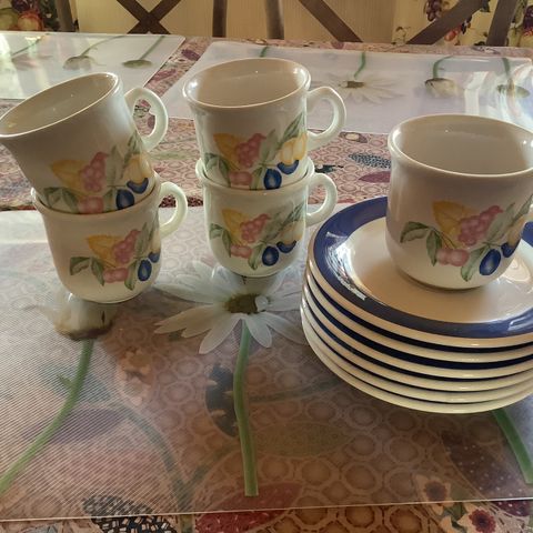 Har også to ekstra kaffekopper og ei skål som følger med hvis ønskelig.