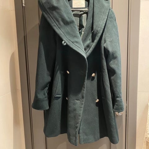 Pent brukt kåpe med hette i ull og kashmir i str 36. Romslig i størrelsen og vil fint passe iallfall str 38/40, (jeg på bilde er nærmere enstr 40)