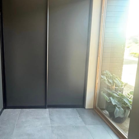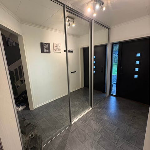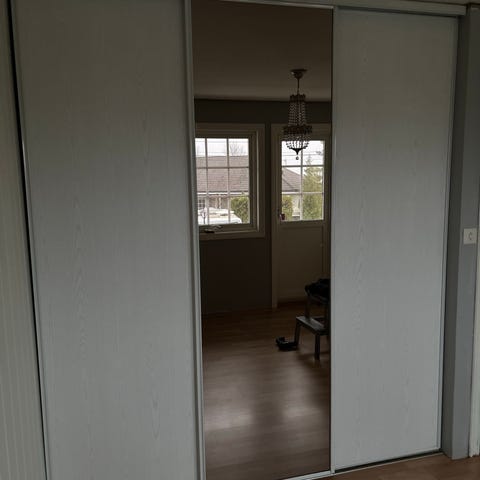 Pent brukt skyvedører fra Langlo. 3 dører á ca. 69 cm pr dør. Medfølger dobbel talskinne og gulvskinne ( ca. 192 cm lang). Lyslist i takskinne.
