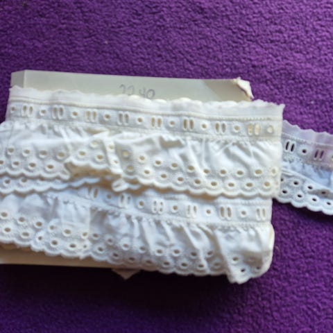 23 meter Hvit blonde med blå pyntekant - bomull - 3 cm bred