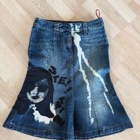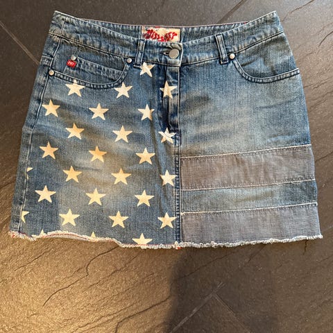 Miss Sixty flerfarget skjørt i størrelse S. Skjørtet har et grønt og rosa blomster- og bladmønster på hvit bakgrunn. Det inkluderer et bredt belte med stor hvit spenne. Laget av lett materiale, egnet for kvinner.