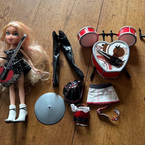 Er lekt med og bruksmerker. Håret er stivt etter voks fra fabrikken, slik at det kan formes alle veier. Tre på perler osv og gjør mye gøy. Håret er som tråder på denne