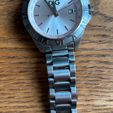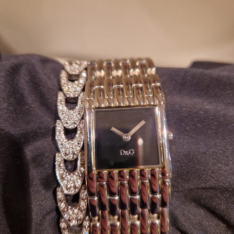 Dolce & Gabbana D&G damearmbåndsur med sølvfarget metallarmbånd dekorert med krystaller. Klokken har en svart urskive med D&G-logo.