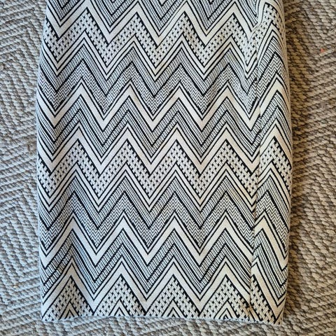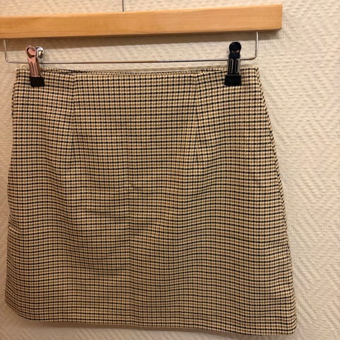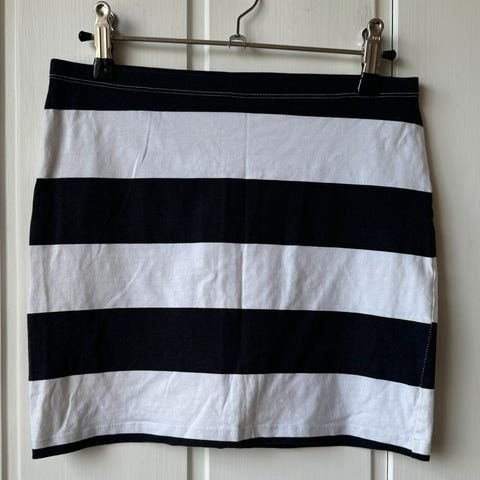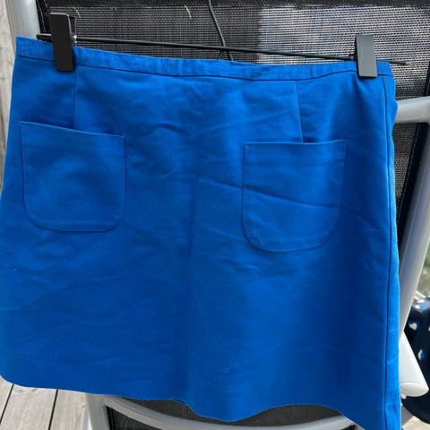 Skjørtet har stikklommer på sidene. Lengde ca 48 cm inkl linning. Strikk i livet.