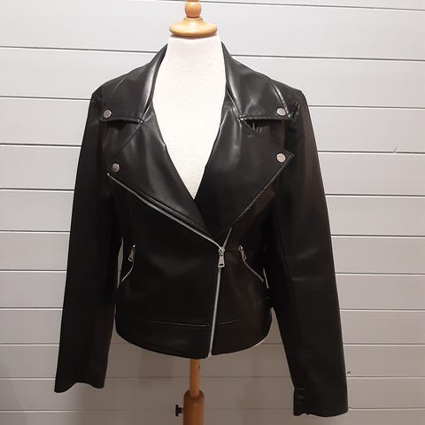 Imitertskinnjakke med hette. Brukt 2 ganger