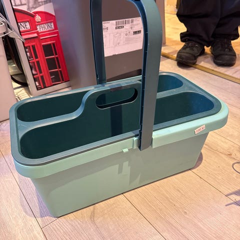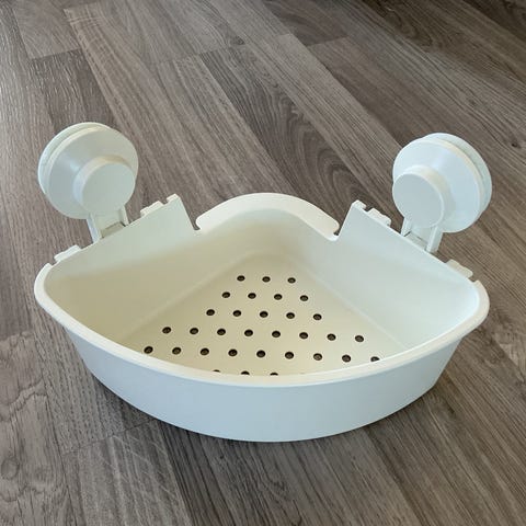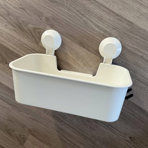 Hengende oppbevaringskurv i hvit plast med hull for drenering. Kurven har to store sugekopper for feste på glatte flater. Egnet for oppbevaring av små gjenstander på bad eller kjøkken.ikea