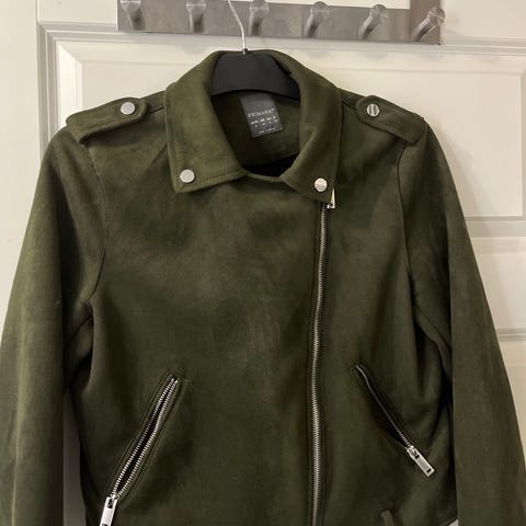 Primark Andre jakker for kvinner i størrelse 40. Jakken er svart og laget av kunstig skinn. Den har glidelåser foran og på lommer, samt en klassisk bikerjakke-design.