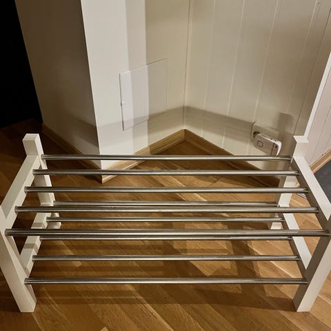 Grått kurvstativ i metall med 6 kurver. Stativet er i god stand og har ingen synlige merker. Perfekt for å spare plass i klesskapet og enkelt å montere/flytte på.