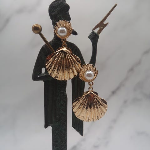 Vintage øreklips i gulltone med elegant skjellmønster og detaljerte ornamenter, og en liten perle. Den ene har en bulk på buen øverst. Mål: 3 x 2 cm.