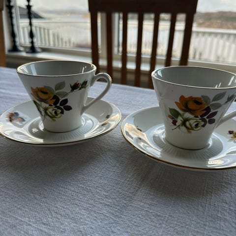 Vintage porselen kopp og asjett med blomsterdesign og skrift Mor og Far.