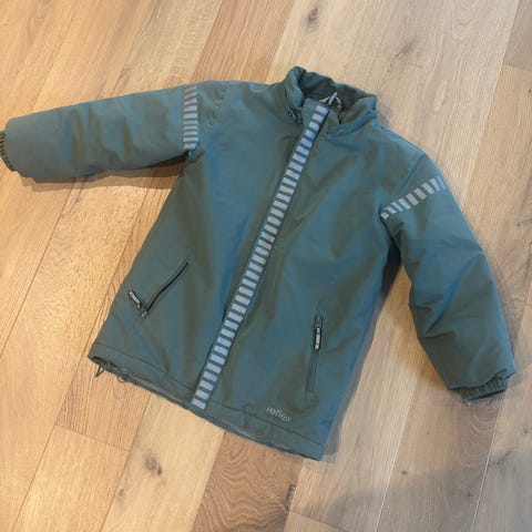 Reflex jakke for barn i størrelse 140, designet for gutter. Jakken er i mørkegrønn farge og har hette.