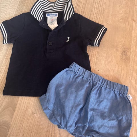 Blå barneklær sett i størrelse 56 for gutt. Settet består av en langermet body og matchende bukser med mønster. Laget for små barn og designet for komfort og bevegelsesfrihet.