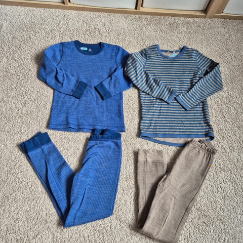 Ullsett med 1 genser og 2 bukser fra Vossatassar. Genseren har slitt print på ermer og begge buksene har flekker/rifter. Se bilde.