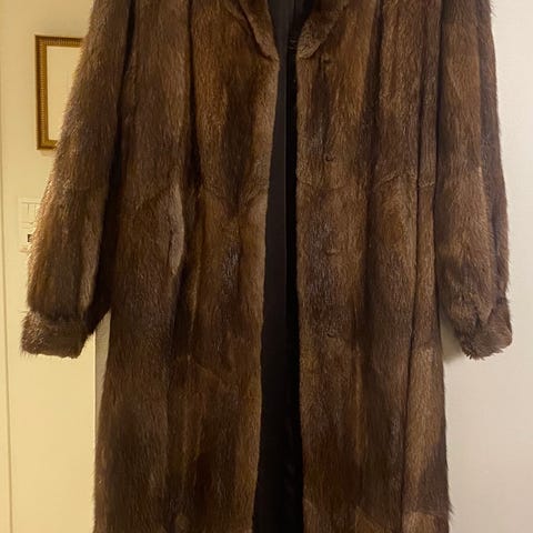 Varm og god jakke i ekte pels. Jeg har kjøpt den brukt. Sømmene har gått opp noen steder i foret og må repareres. Det mangler også en hekte øverst.