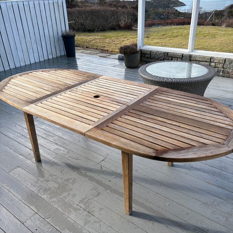 Ukjent merke trebord for utendørs bruk, mørkebrunt, laget av tre. Bordet har en rektangulær form med spalter i bordplaten, egnet for hage eller terrasse.