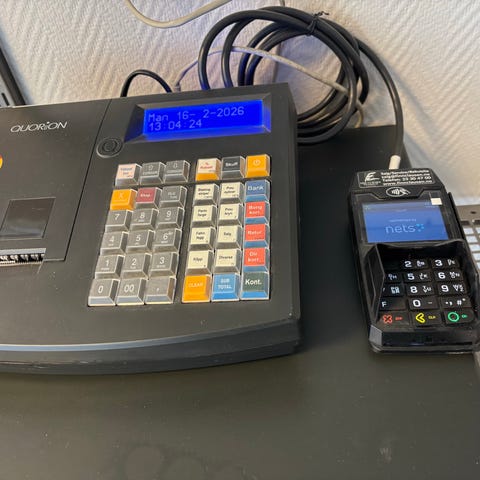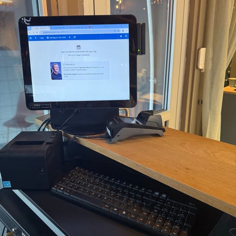 Berøringsskjerm med tastatur og tilbehør inkludert strømkabler, strekkodeskanner, betalingskortleser og kvitteringsruller. Enheten er egnet for mobil databehandling og betalingstjenester.
