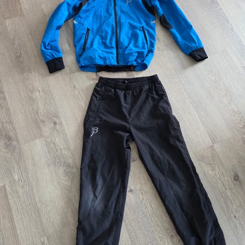 Treningsdress for barn. Dressen består av jakke og bukse i svart og turkis farge. Materialet er egnet for sport og fritidsbruk.