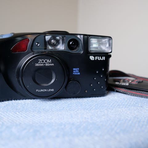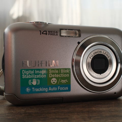 Fujifilm DL210 kompaktkamera med svart farge og bærbar design. Kameraet leveres med etui og håndstropp, egnet for enkel fotografering og transport.