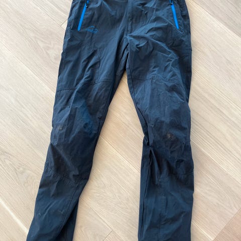 Buksen har lommer i sidene, glidelås og borrelås nederst på beina for stramming.
