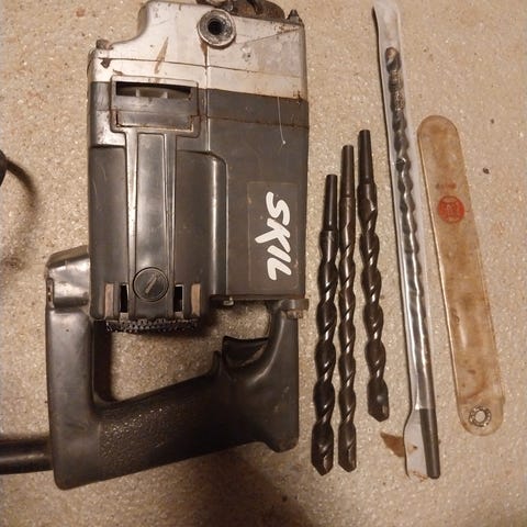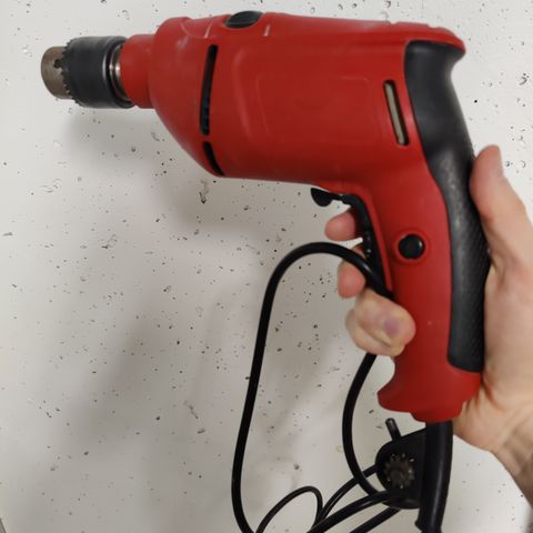 elektrisk drill med en effekt på 600 watt. Drillens farge er blå, og den har en kablet strømkilde med standard plugg. Utstyrt med en metall chuck for feste av bor og annet tilbehør.