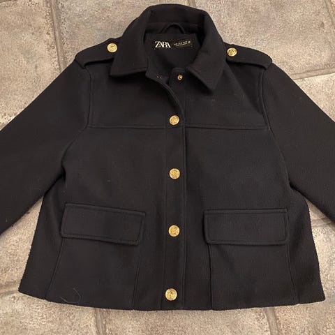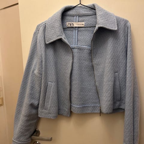 Utrolig stilig blå Zara paljettjakke med sølvfargede stjerner i størrelse L. Lukkes med sølvknapper og med dype lommer på fremsiden.